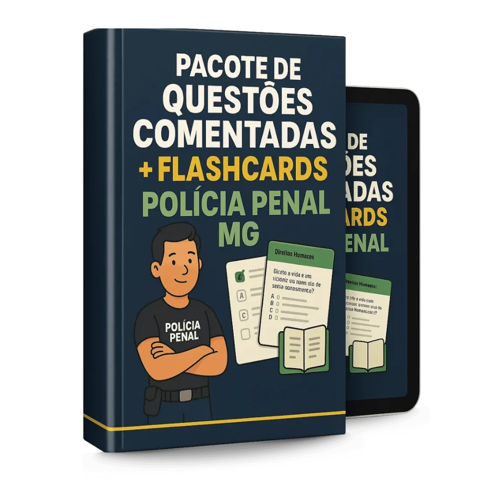 Criamos um material completo com mais de 400 questões comentadas e flashcards práticos, separados por disciplina e por tema, com base no que mais aparece nas provas da Polícia Penal MG.